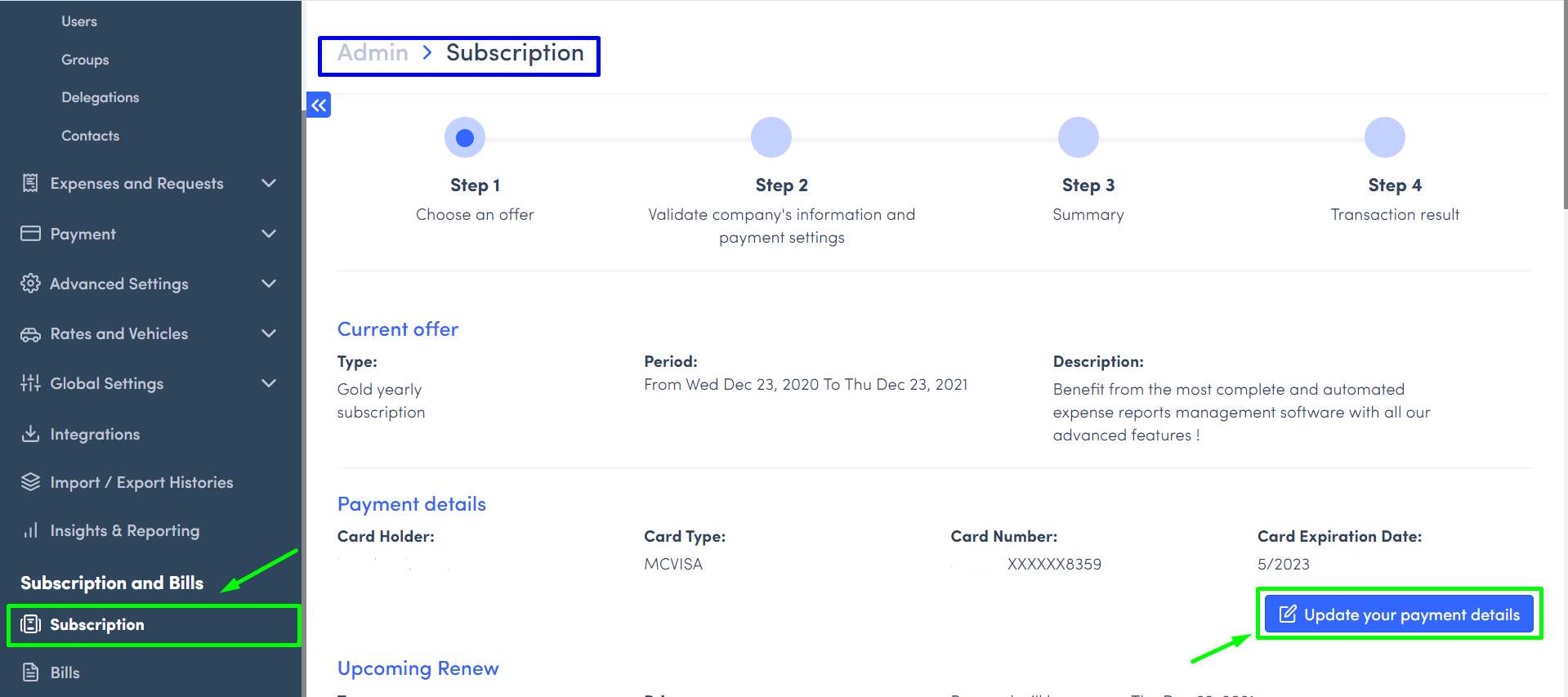 On Expensya, only the account admin can cancel the automatic renewal of the subscription.