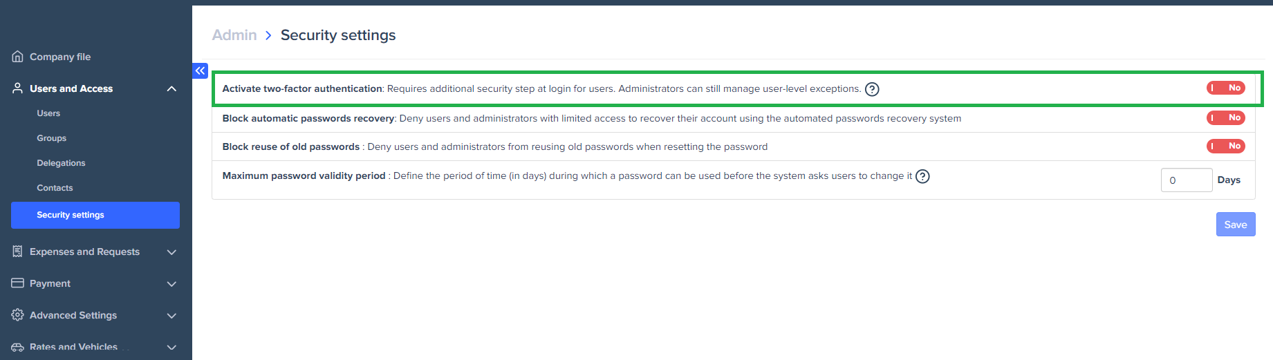 Expensya now allows administrators to activate the two-factor authentication feature within their tenant. This feature enables administrators to enforce enhanced security practices and control the requirements of two-factor authentication (2FA) for all users within their organization.