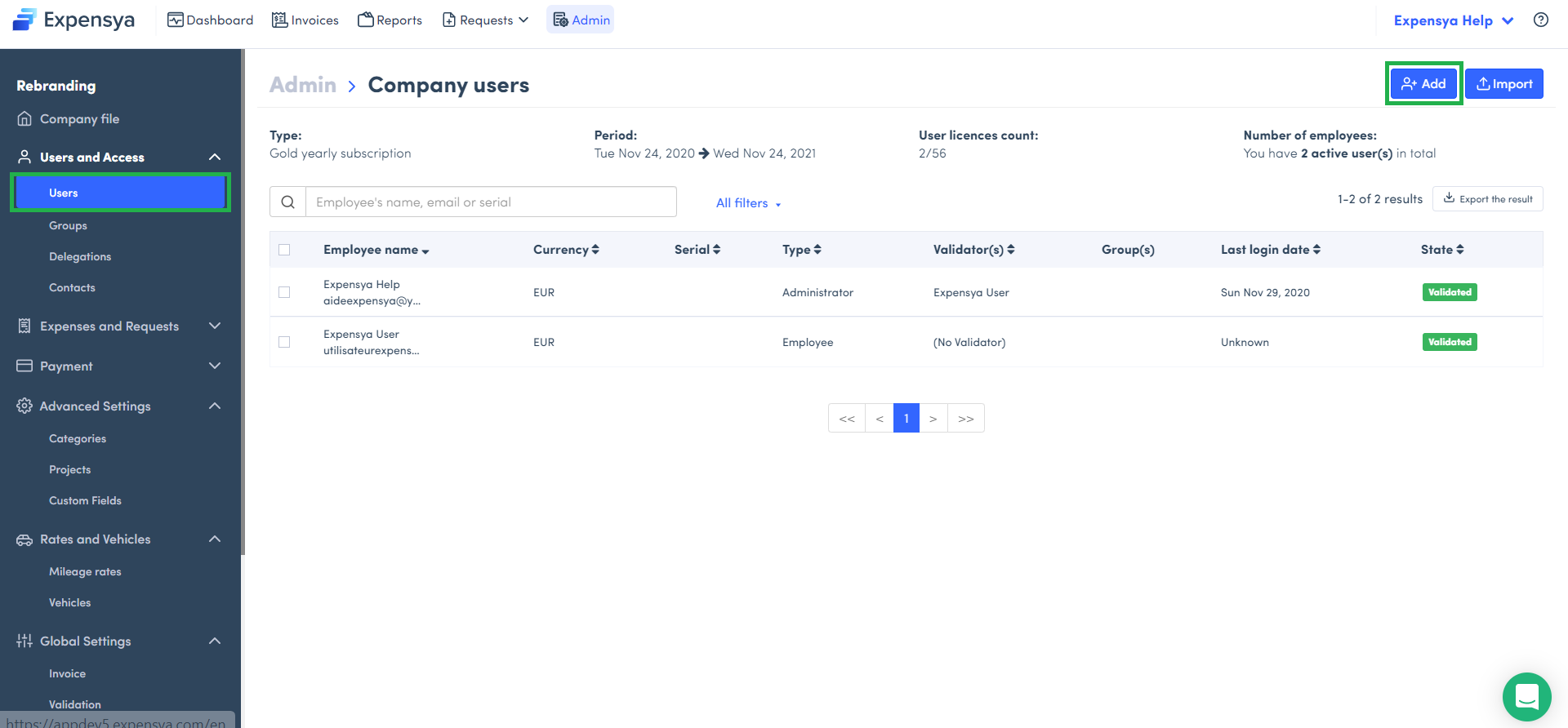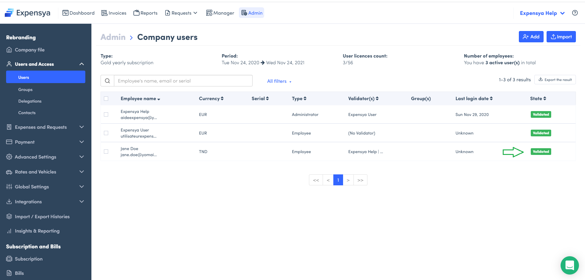 The added user will receive a link by email to validate their account and generate a password. As soon as they validate the account, the status will switch to validated.