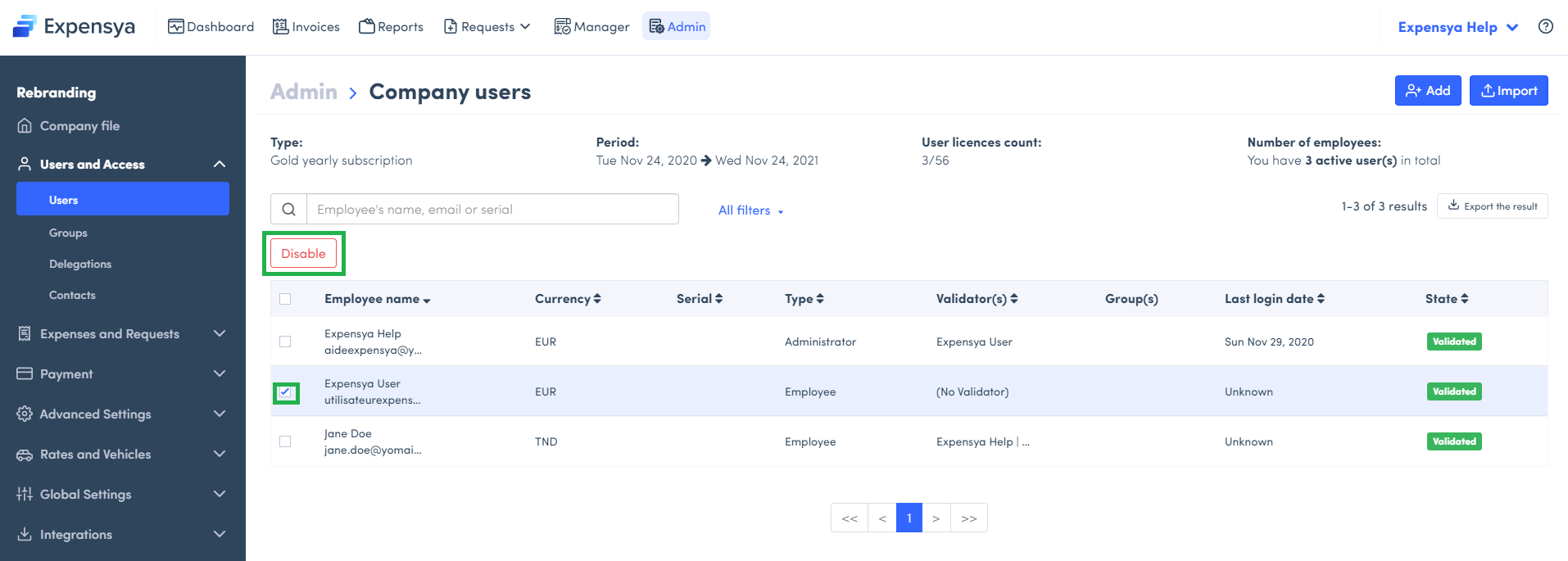 Note: It is not possible to completely delete a user with expense reports and expenses, as their history must always remain associated with the tenant.