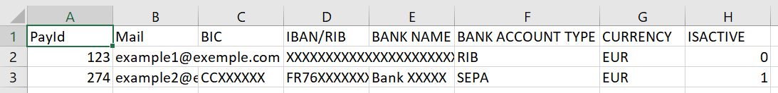 - BIC (or Swift code): Corresponds to the international identifier of the bank (This field is mandatory in case of IBAN insertion).