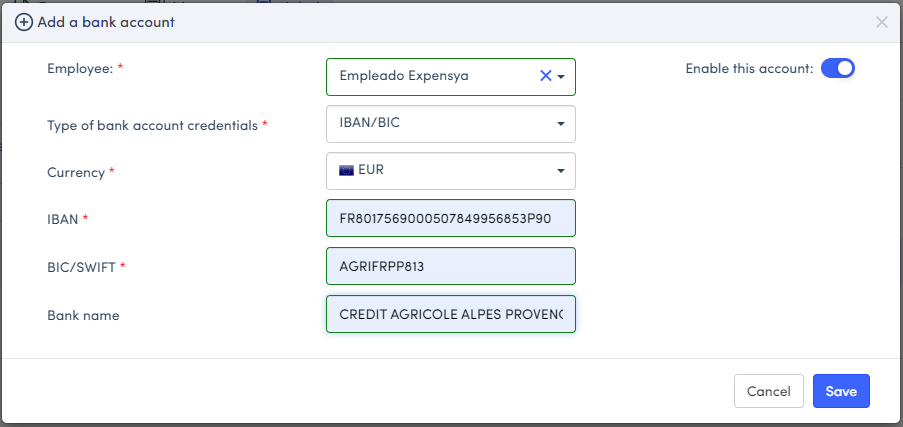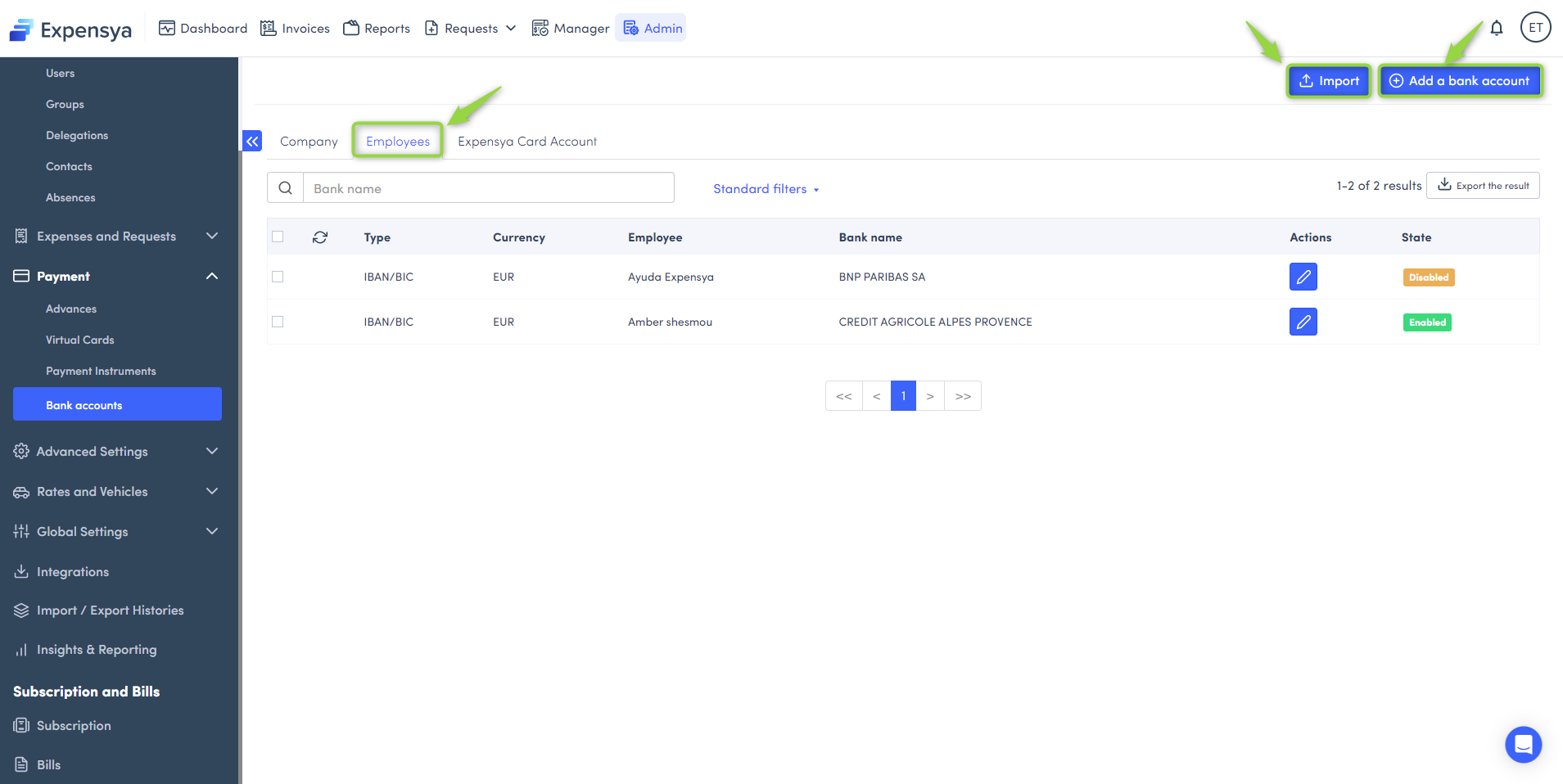 As an administrator, Expensya provides you with the capability, accessible through the web version, to seamlessly add both your tenant's bank accounts and those belonging to your employees.