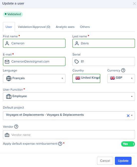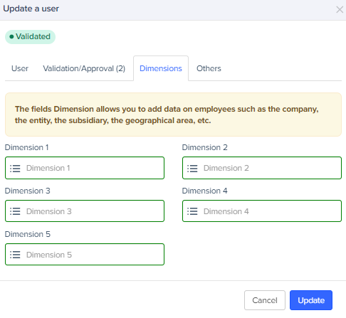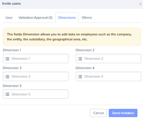 Expensya provides you with the ability to easily implement Dimensions for each employee. These can be created and modified directly from each employee's profile, allowing you to associate as many dimensions as needed based on your requirements for analysis, reporting, or accounting integration.