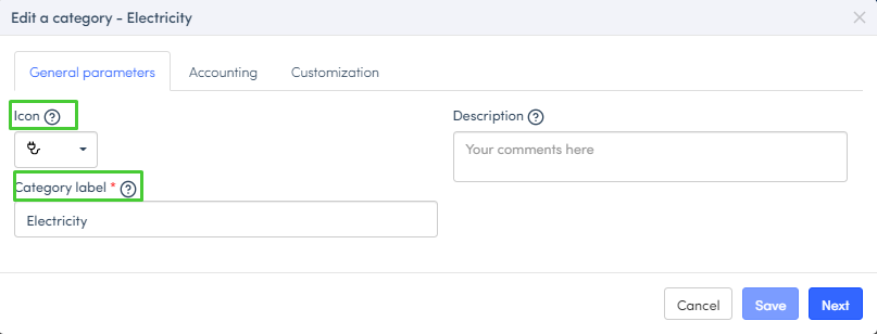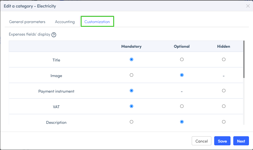 To manage the fields of an expense according to its category: