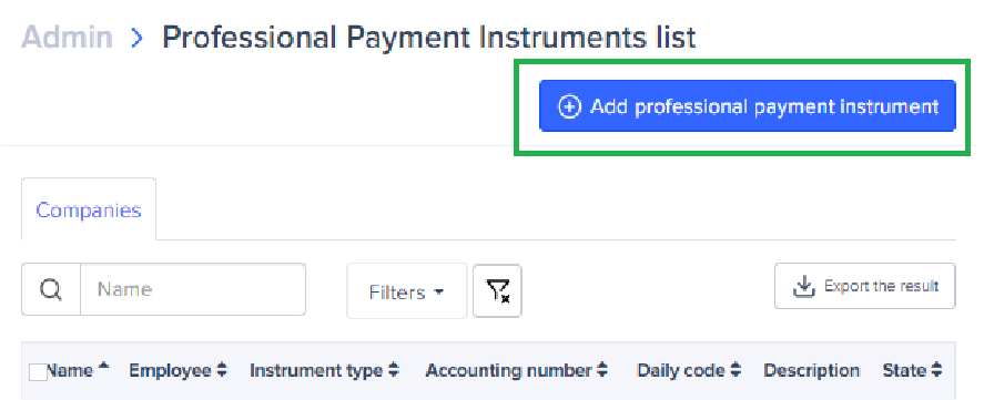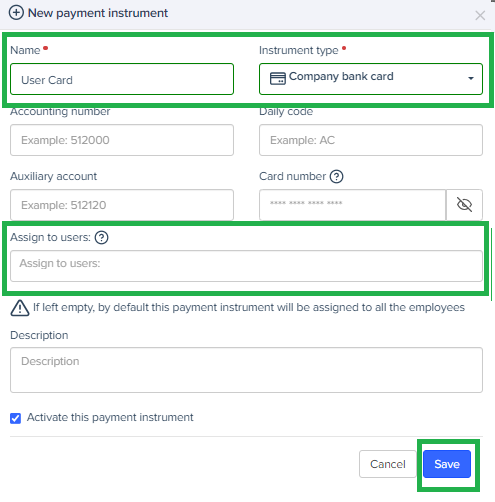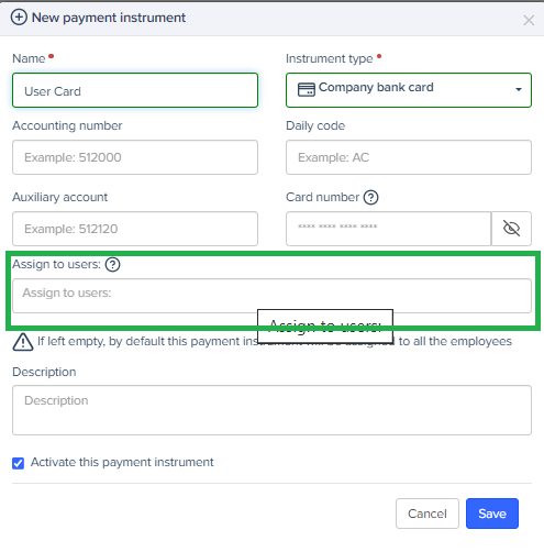The administrator can assign the professional payment instrument to one or more employees by indicating their name(s) in the “Assign to users” field.
