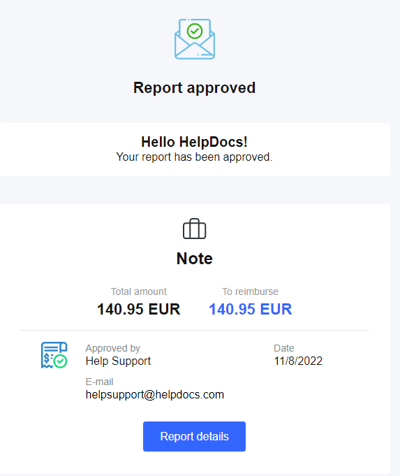 When the approver approves a report, the employee receives an email notification that the report has been approved.