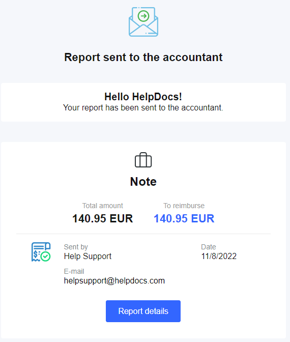 After the report is sent to the accountant, the employee receives an email notification that the report has been sent to the accountant.