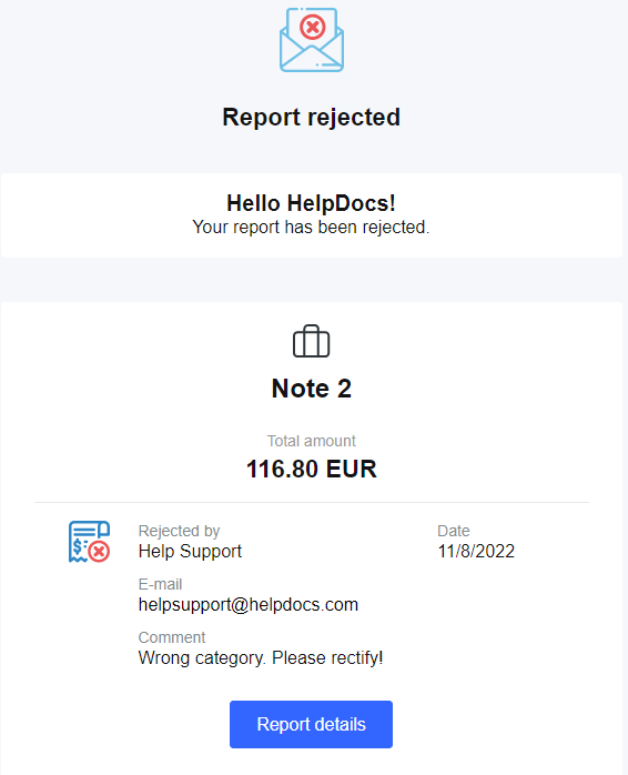 When the approver rejects a report, the employee receives a notification email to inform him that his report has been rejected.