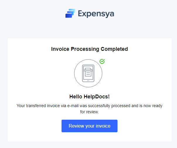 When the employee transfers an invoice via e-mail processing, he/she receives a notification e-mail to inform him/her that the transferred invoice has been successfully processed and is ready to be checked.