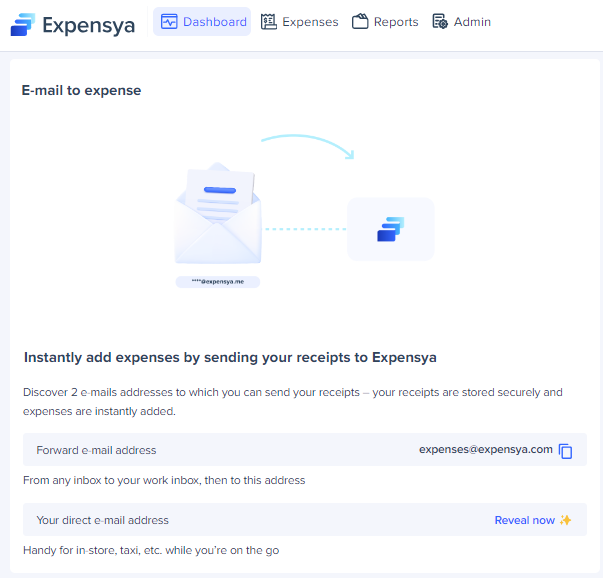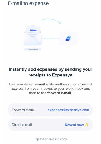 Your personal direct address will appear, and you can copy it and use it to submit expenses via mail.
