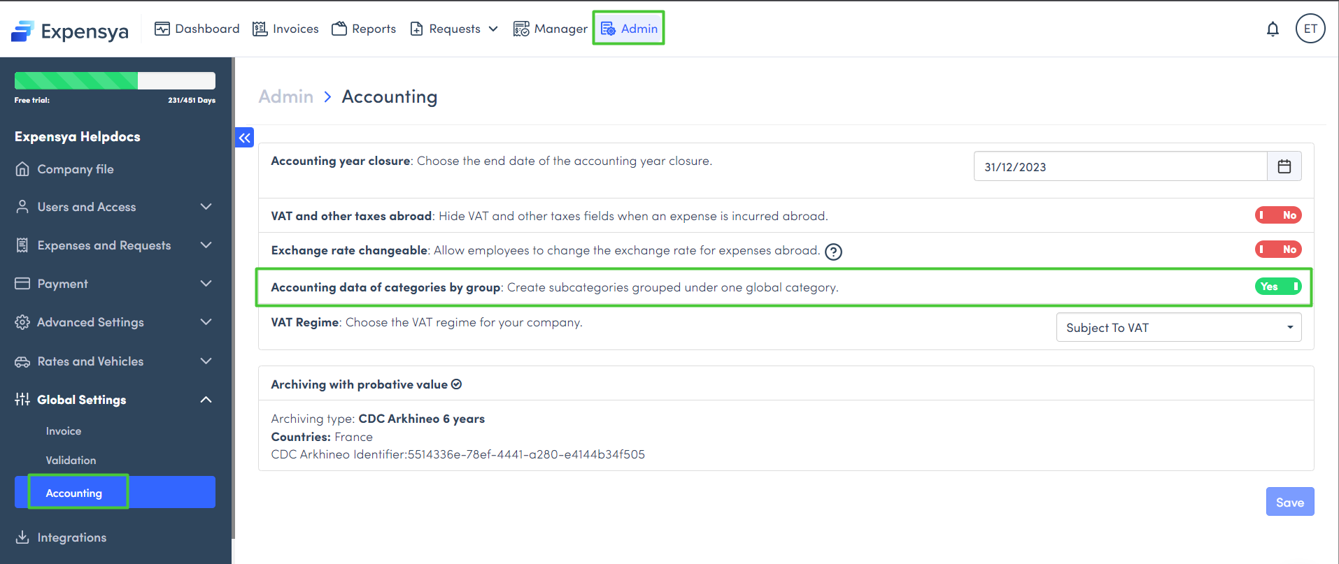 - Activate the feature: Accounting data of categories by group: Enables you to create subcategories grouped under the same global category (parent category).