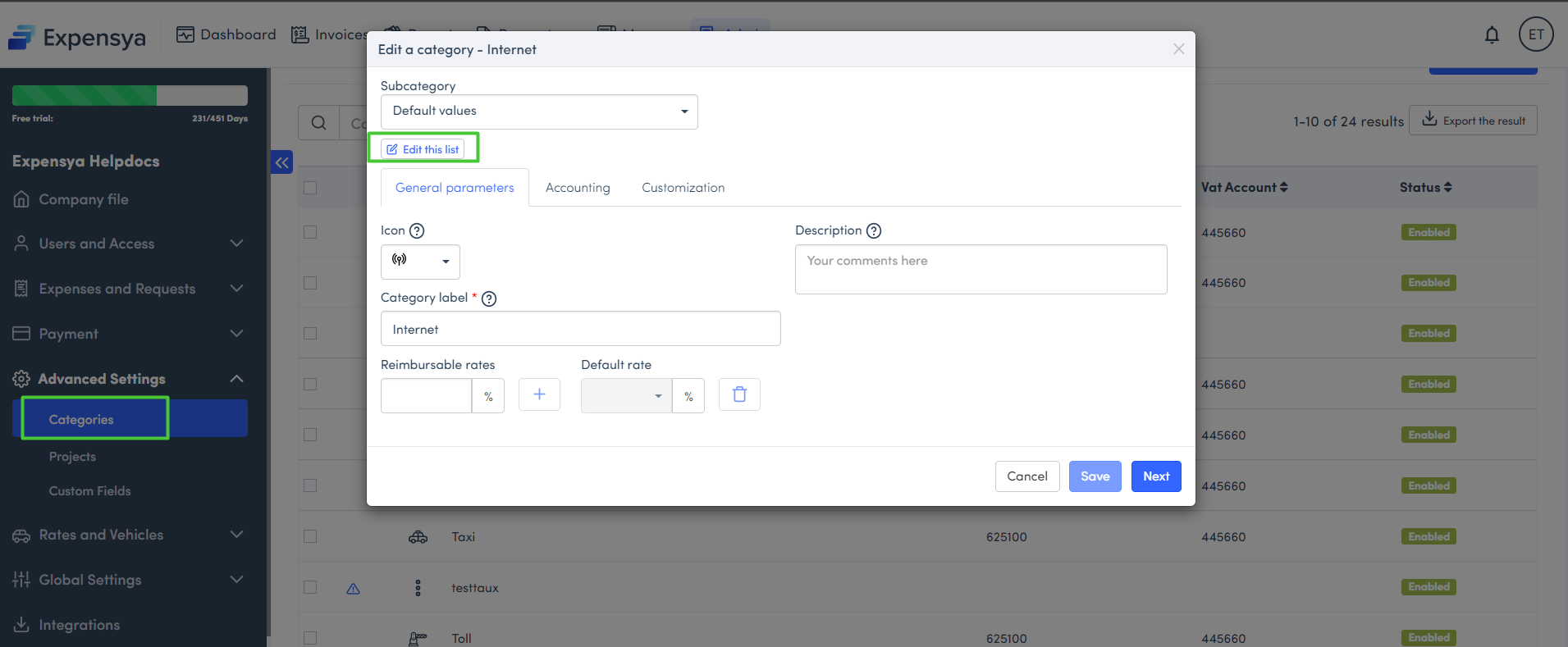 - Click on the Subsidiary or entity field and choose the correct subsidiary, modify the category title, select the Accounting tab to modify the expense and VAT accounts. Save.