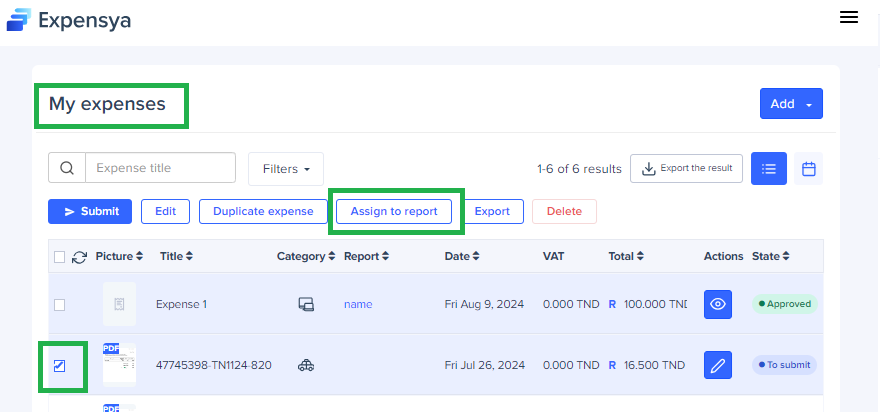 - Check the Expenses or mileage to assign from the Expenses tab.