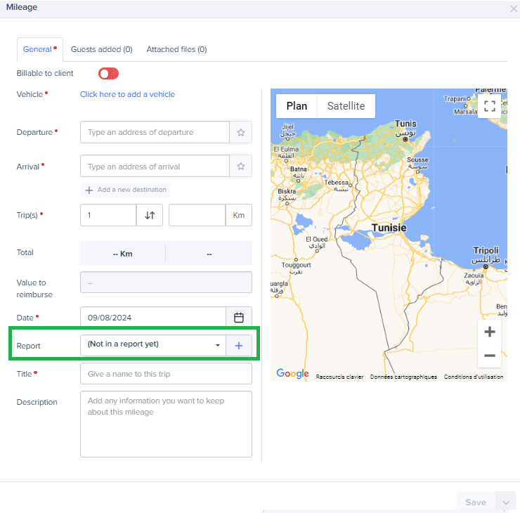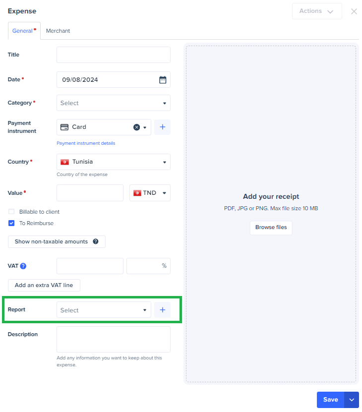 - From the form of expense creation, in the "Report" field, create a report by clicking on the "+" or select an existing one from the drop down list.