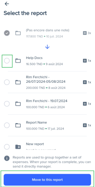 - Select the report to which you want to assign the expense and press Move to this report.