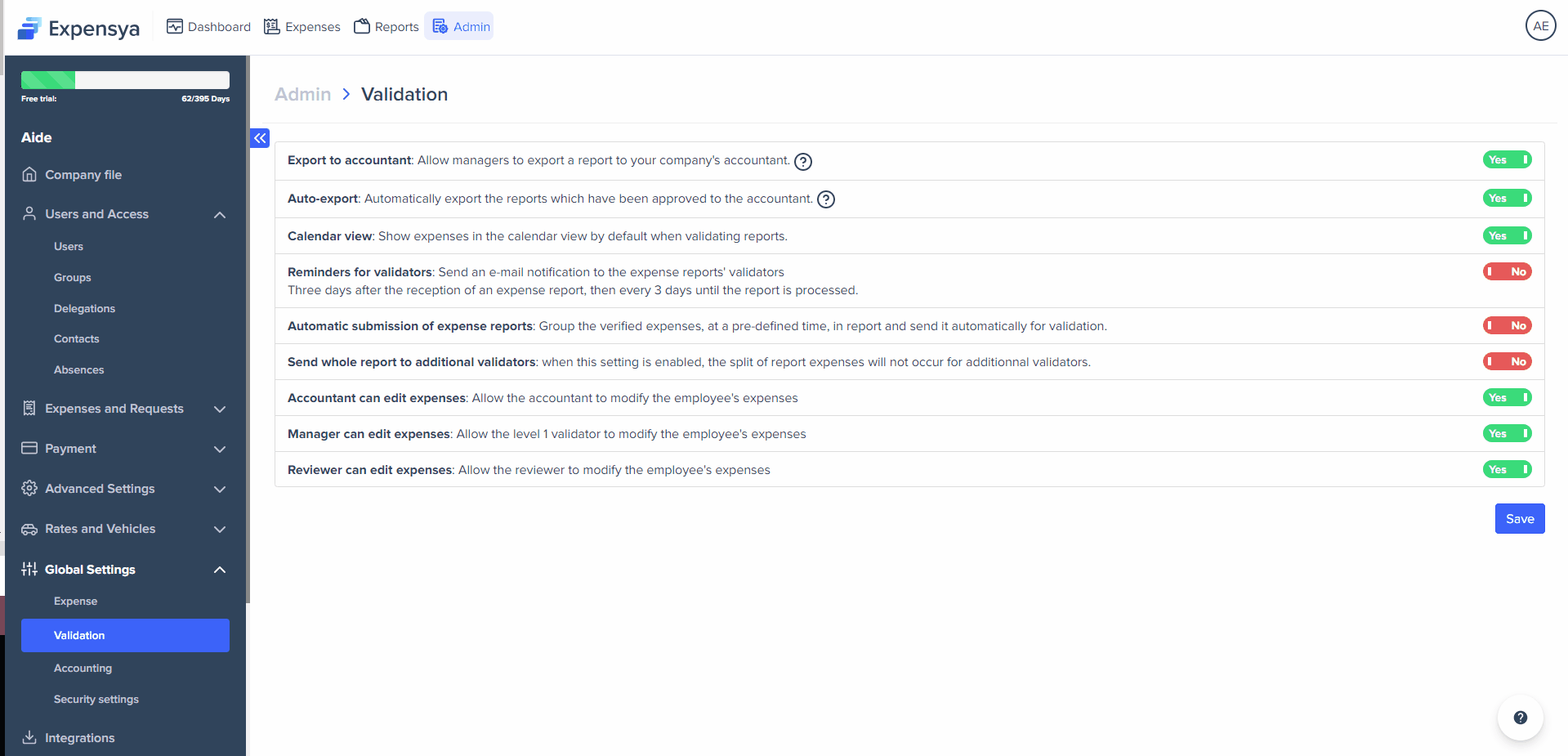 - Start date: Date from which the automatic submission of verified expenses will be activated.
