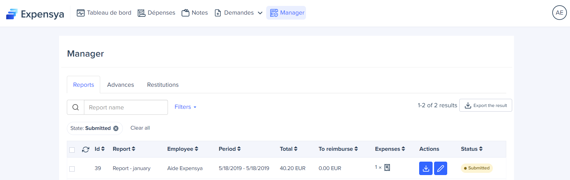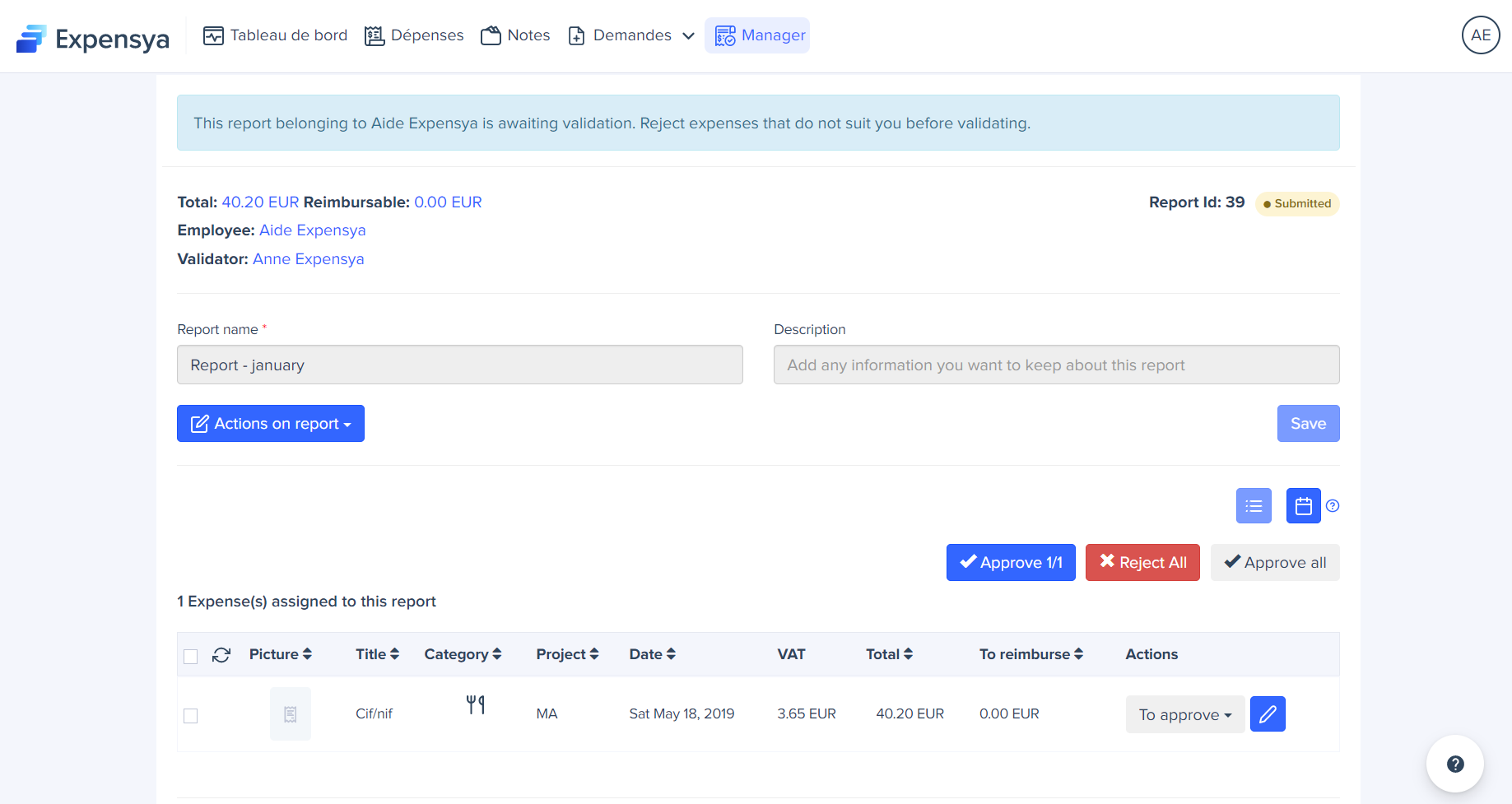 - Reject all: to reject the entire report, it will be sent back to the employee for modification.