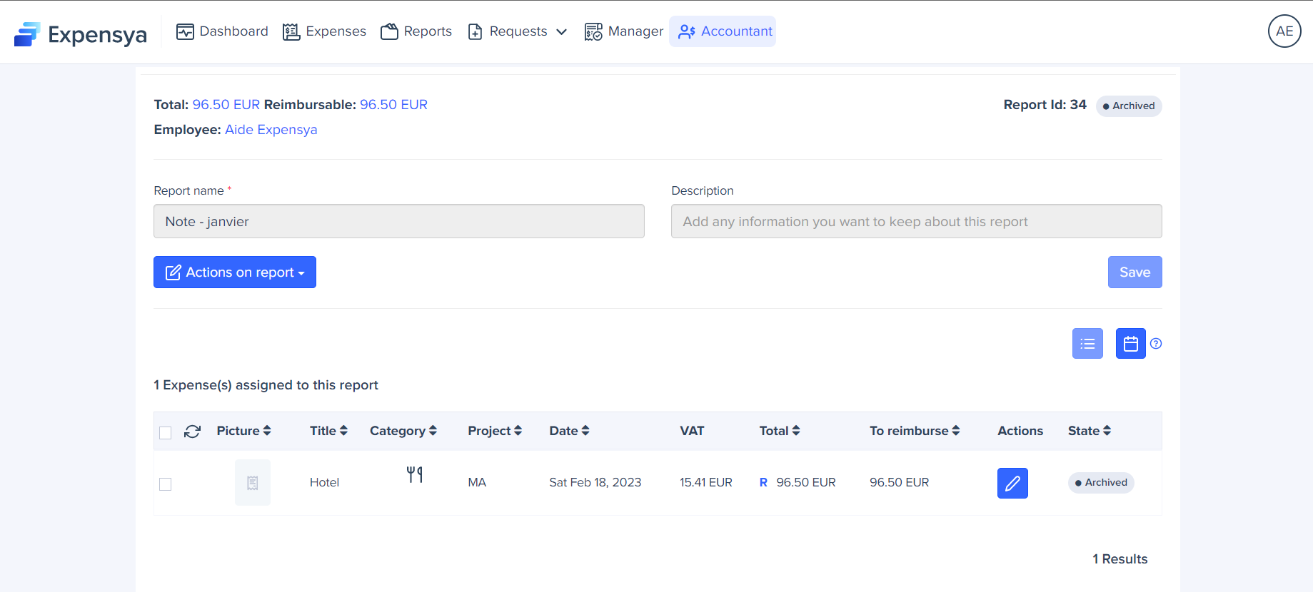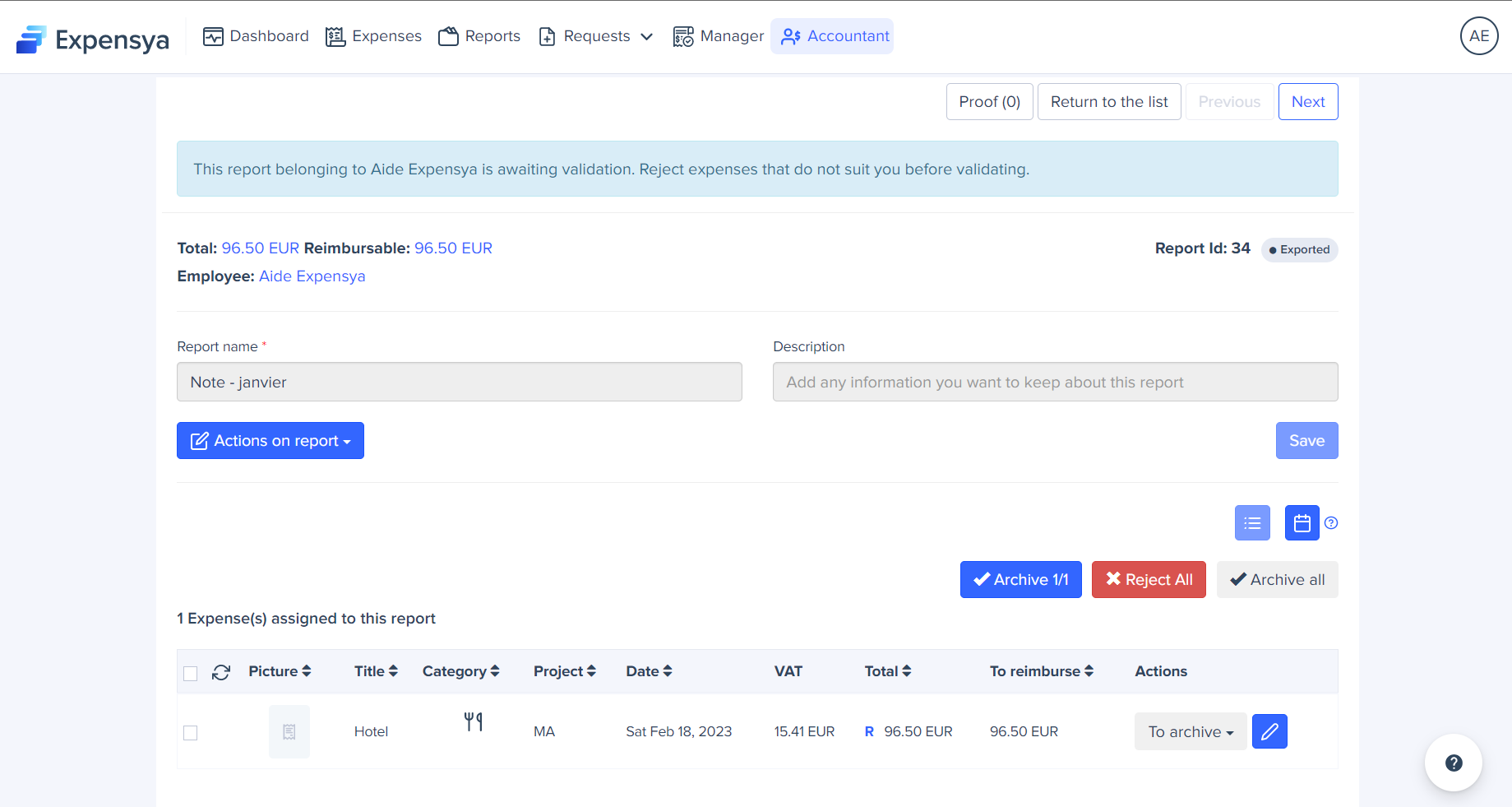 Archive All:: the report is ready to be integrated into the accounting system and reimburse the employee. The report's status is now 'Archived'.