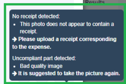 Expensya allows verification of image quality and displays a warning in the expense list. If the image quality is insufficient (e.g., blurred), a warning is sent to both the employee and the approver.