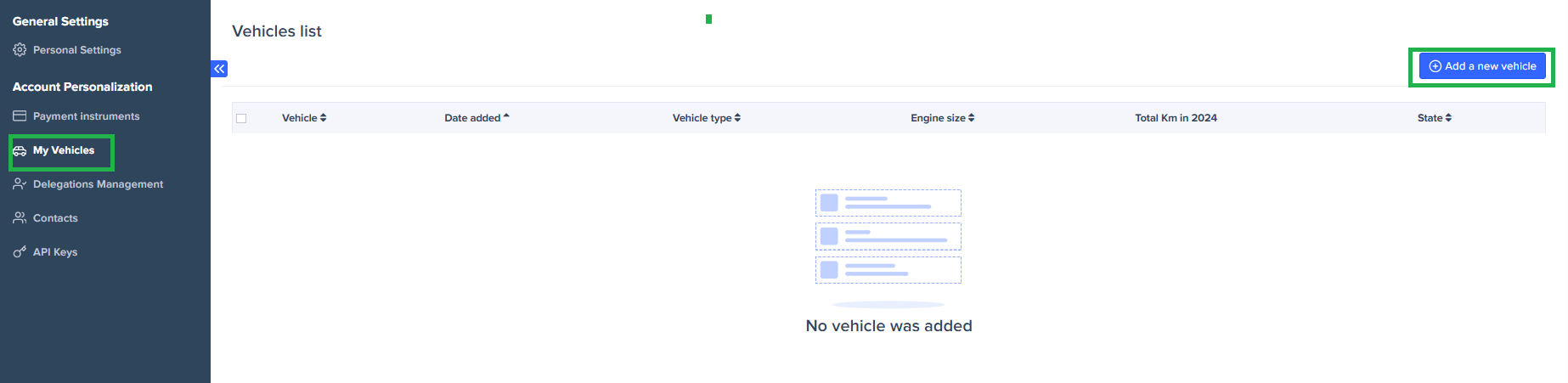 - After you are redirected to your settings, click on Add a new vehicle and fill in the different fields, indicating the type of vehicle, fiscal power, etc.