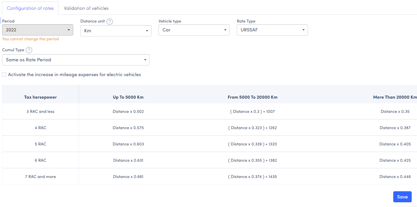 When this value, added to the total sum of mileage expenses entered in Expensya during the current year, exceeds 5000 km (first level of reimbursement), you move to the second level.