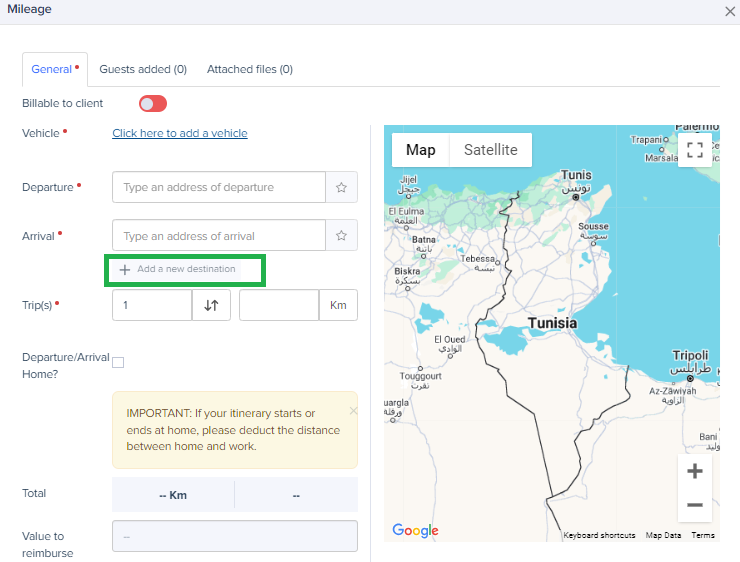 Expensya uses the Google Maps API to calculate distances traveled. This integration allows Expensya to automatically provide accurate mileage calculations for your business trips.