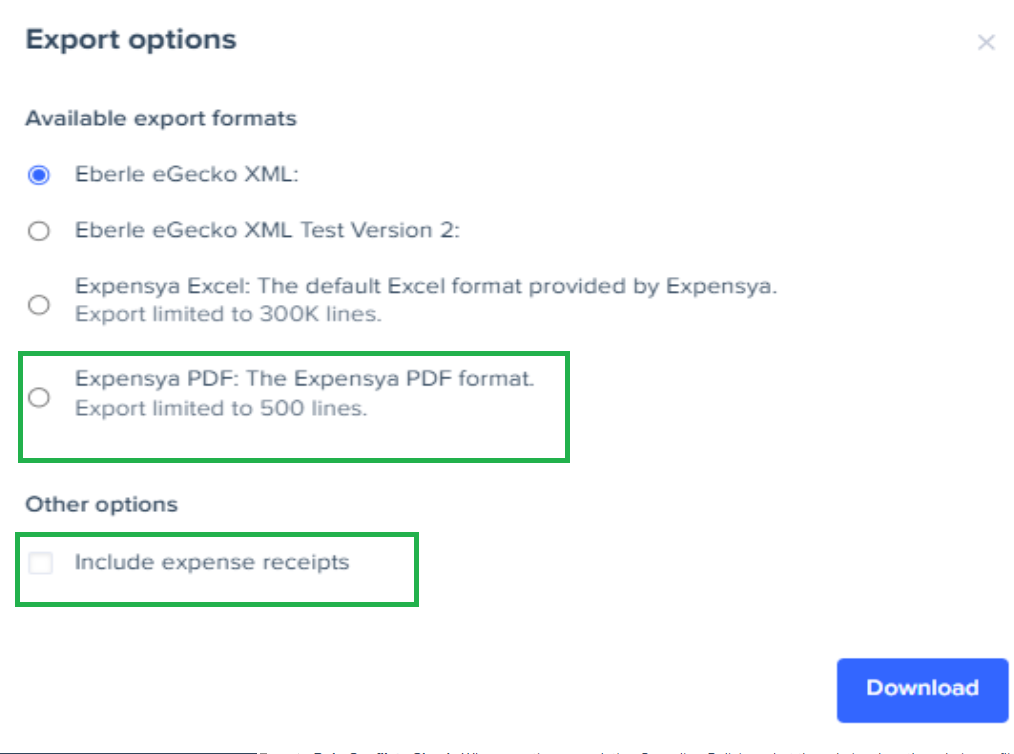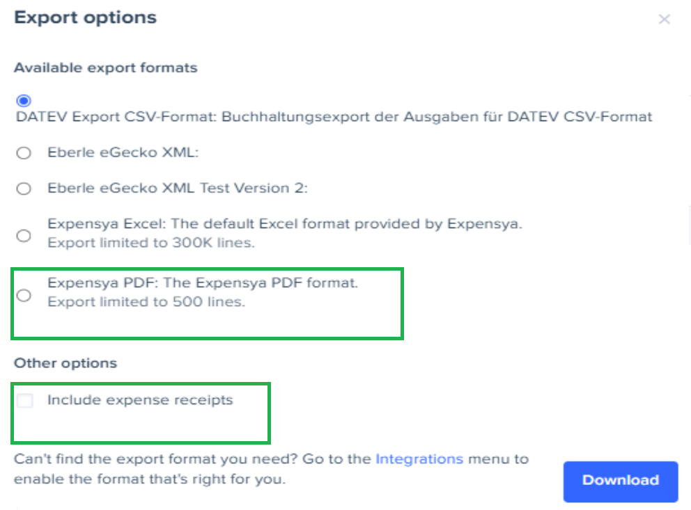 - Select the export format as Expensya PDF, while checking include expense receipts.