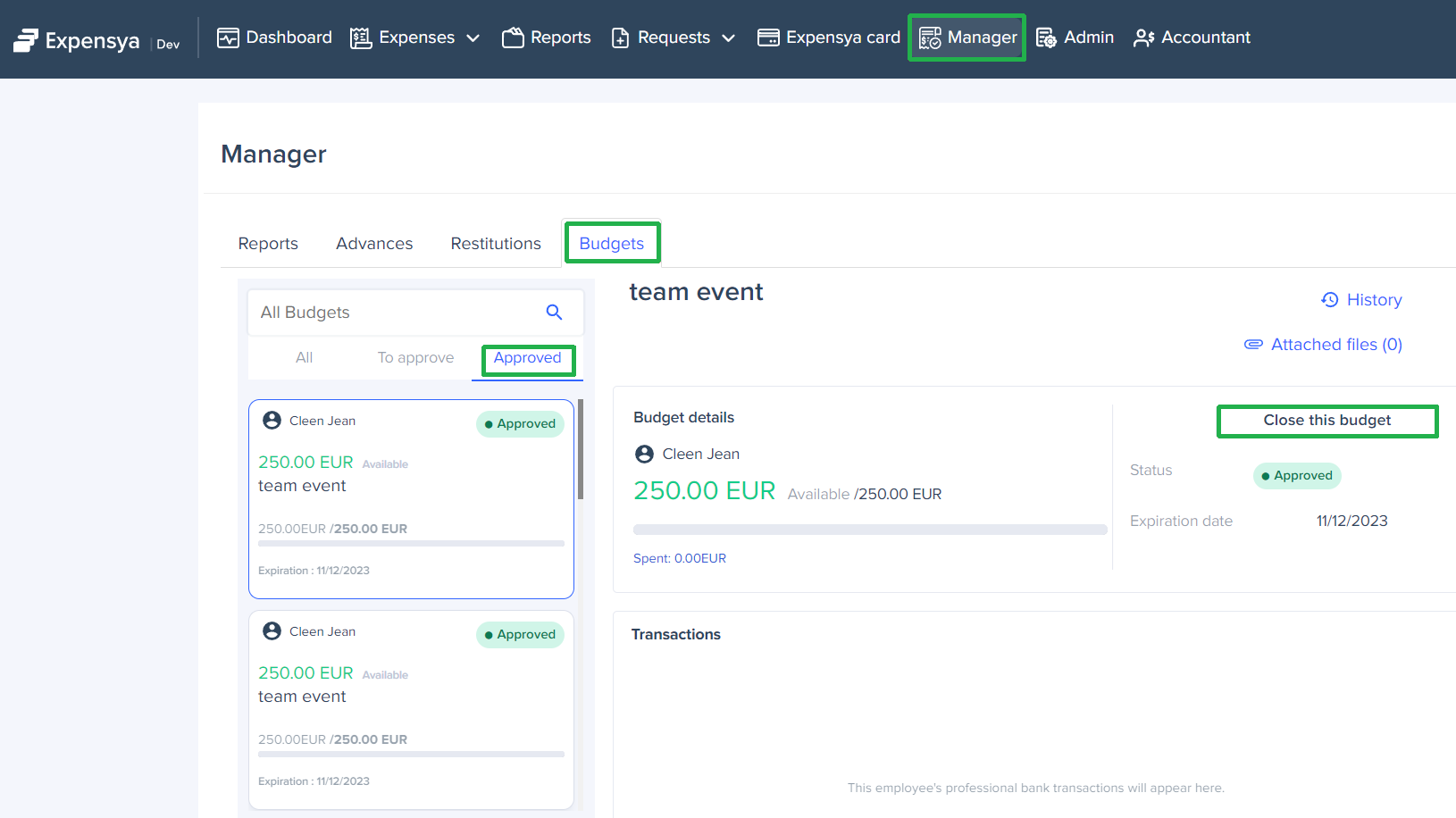 - Connect to Expensya web application and access to the Manager menu, select Budgets tab then Approved budget status.