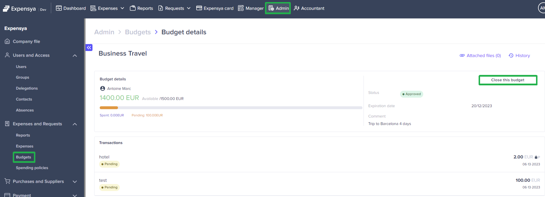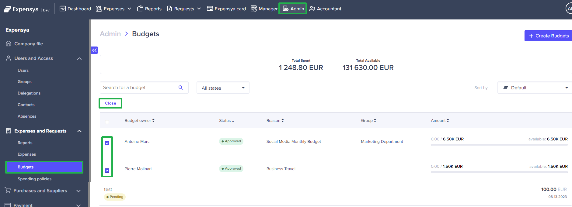 - Access to Admin page, then Expenses and Requests” menu and click on the sub-menu Budgets