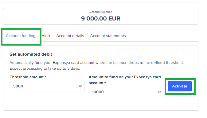 Admins have the ability to set up automatic funding for their Expensya Card accounts, ensuring continuous operation and preventing transaction rejections due to insufficient balance. Although manual transfers from the tenant account to the Expensya card account are an option, admins may find it challenging to predict the exact amounts and timing needed to maintain an adequate balance. Automatic funding offers a convenient solution to maintain the required funds proactively.