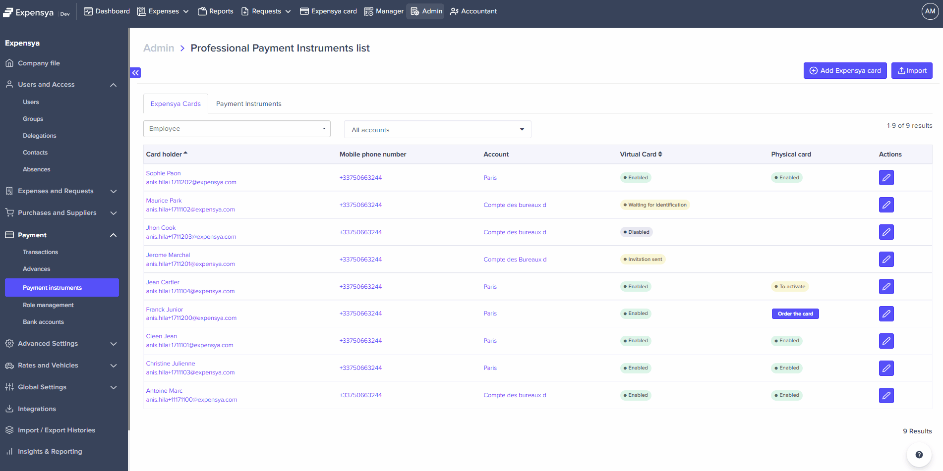 - As an Admin with the Can manage cards payment role, browse to the Payment Instruments section under the Payment menu, and view the list of Expensya cards under the Expensya cards tab.