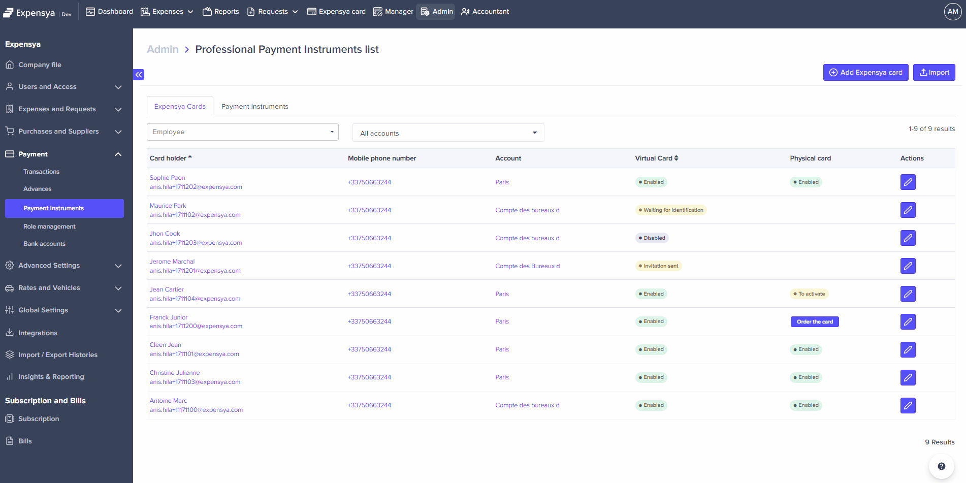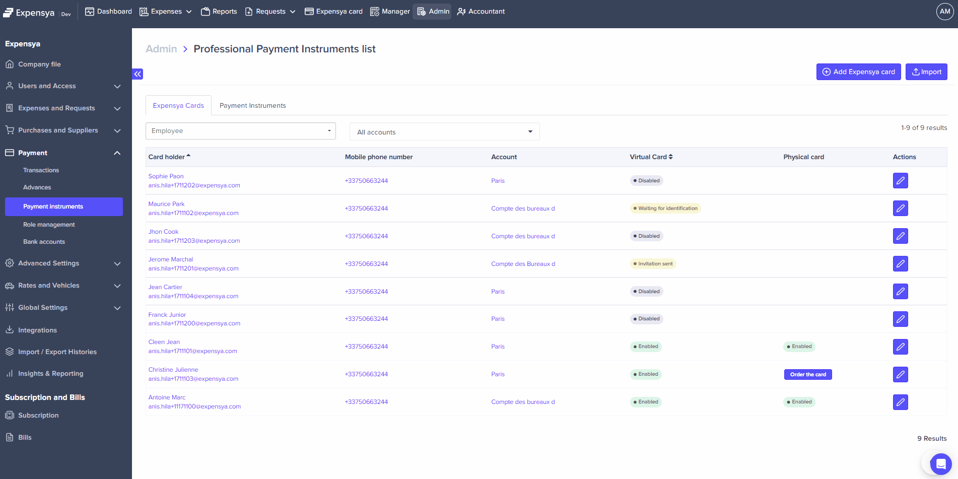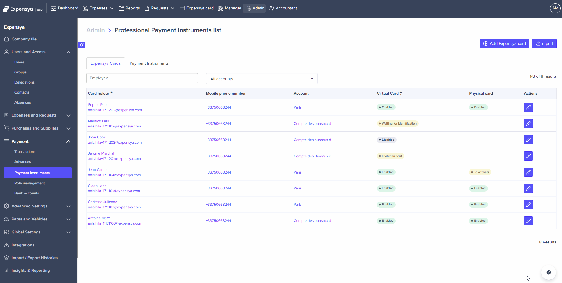 - As an Admin with the Can manage cards payment role, browse to the Payment Instruments section under the Payment menu, and view the list of Expensya cards under the Expensya cards tab.
