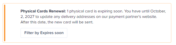 Tip: The admin can use the filter Expires soon to get the full list of the physical cards that are expiring in the upcoming 10 weeks window.