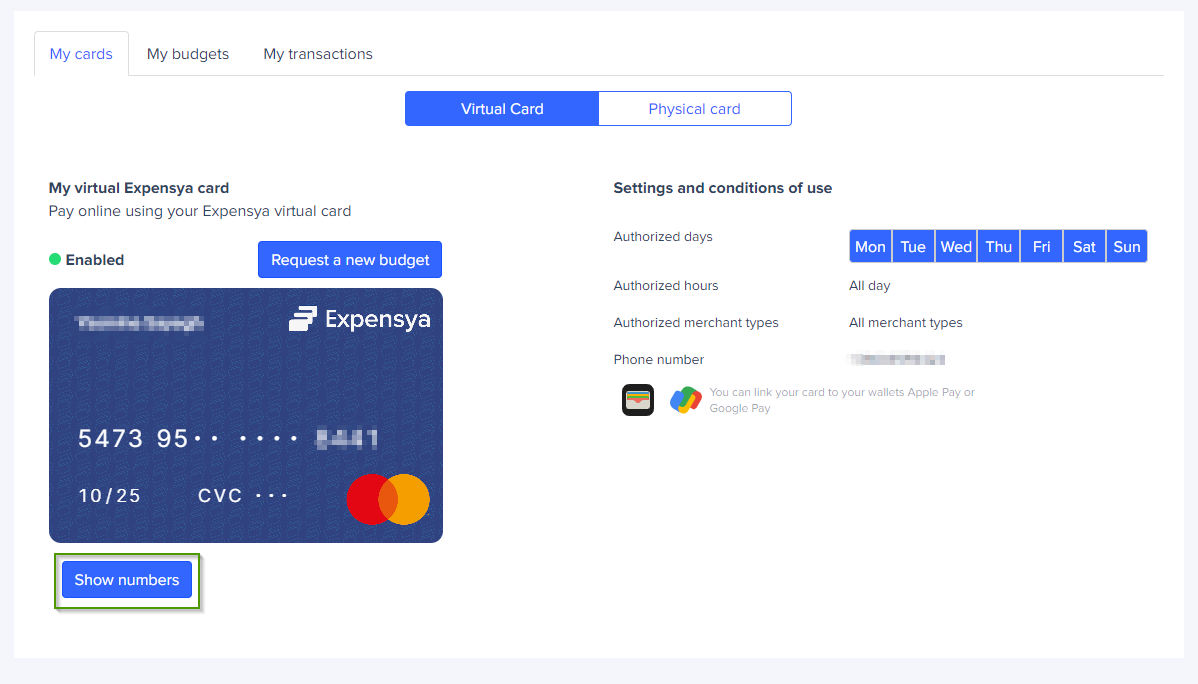 If you have been assigned a virtual card by your employer, you can use it in two ways: you can either use the card details for online payments or manually add the virtual card to your digital wallet (Apple Wallet or Google Wallet).