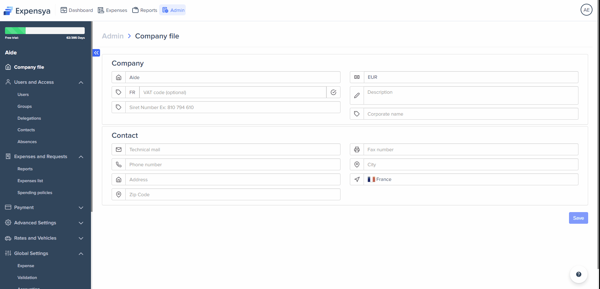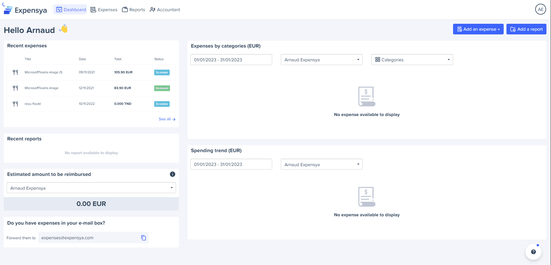 The exported file extracts all the data from the expenses to give the accountant information on the nature of the upcoming expenses, the amount including VAT and excluding VAT, the VAT claimable/unclaimable, the allocations to the cost centers/businesses and the link between the expense, the expense report, the employee who made the expense, etc.