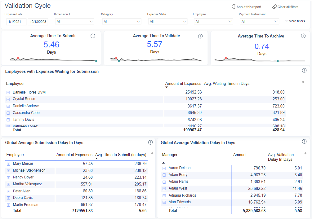 One of the primary features of the Validation Cycle Dashboard is its ability to track the time taken for employees to submit their expense reports and for managers to validate them. By monitoring these durations, organizations can identify bottlenecks in the approval process and take corrective actions to expedite reimbursements. - Bottleneck Identification: