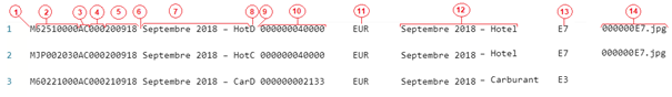 14 | Alphanumeric | 11 | Invoice attachment name: E + invoice number in Expensya + file extension | 000000E7.jpg |