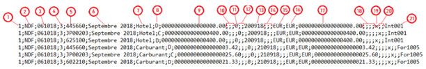 5 | Alphanumerical | Accounting account corresponding to the line: - Debit Line: - Net Amount: Expense category charge account - VAT: VAT category account - Credit Line: Employee ID | 625100 |