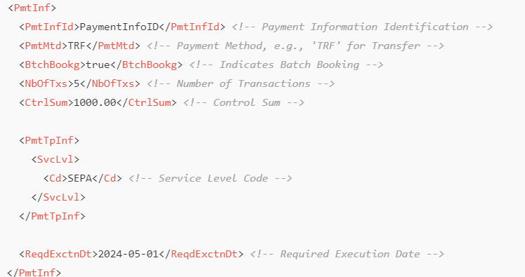 - <PmtInf> (Payment Information)