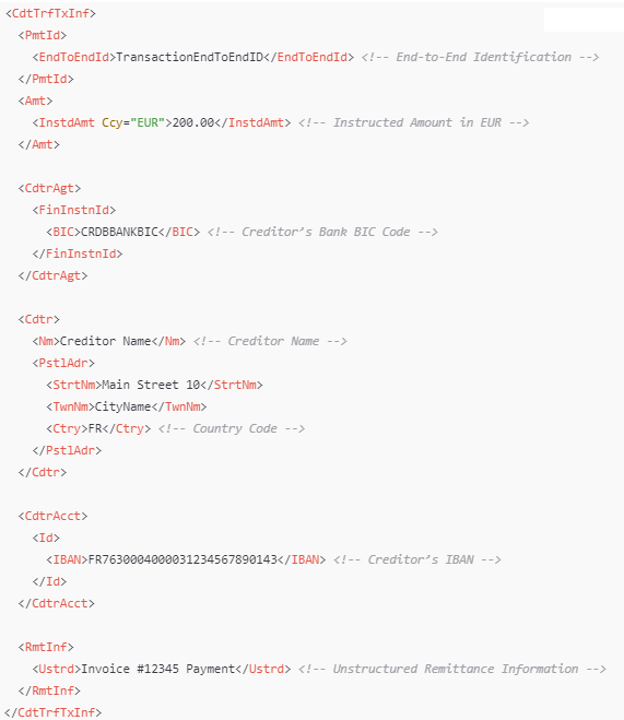 A SEPA XML file consists of various blocks that detail the transaction and related information. Below is a breakdown of these components: