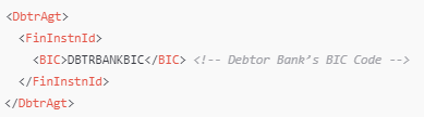 - <DbtrAgt> (Debtor Agent)