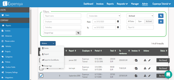 You can export your archived reports from Expensya to QuickBooks by following these steps: