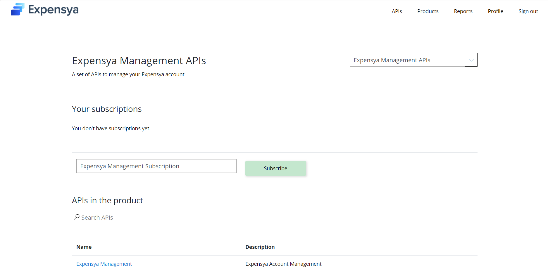 Once connected, the Expensya API page will be displayed with our various APIs products.