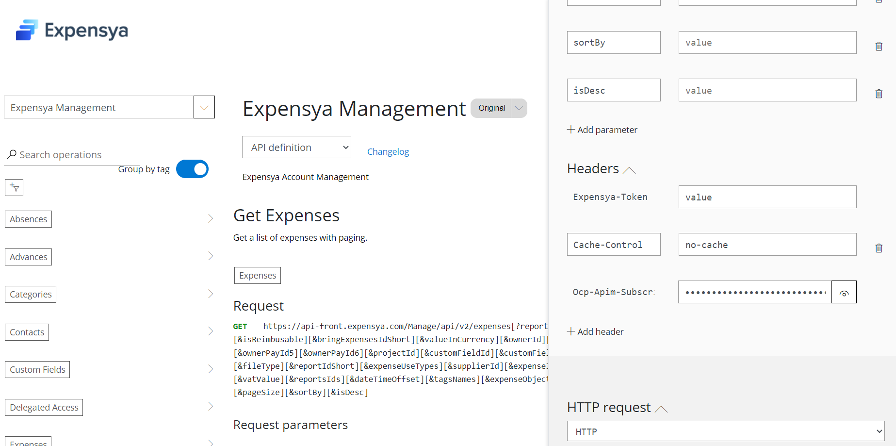 - The token created after the subscription on the product Expensya Management API will be used as an input for the header of the Ocp-Apim-Subscription-Key.