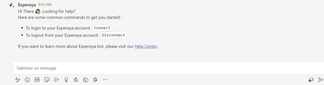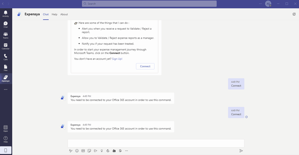 The Expensya application in Teams supports Single Sign-On (SSO). Simply send the command Connect in the Teams conversation, and the synchronization with your Expensya account will automatically occur based on your email address. This message is available in English only. Click on Connect.