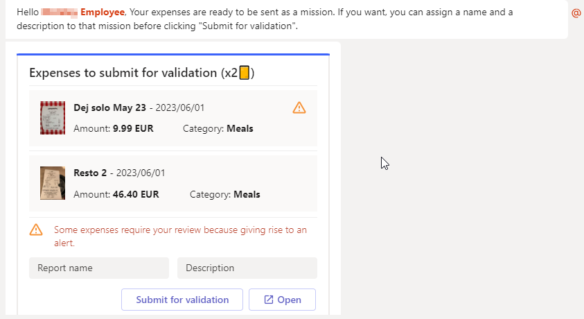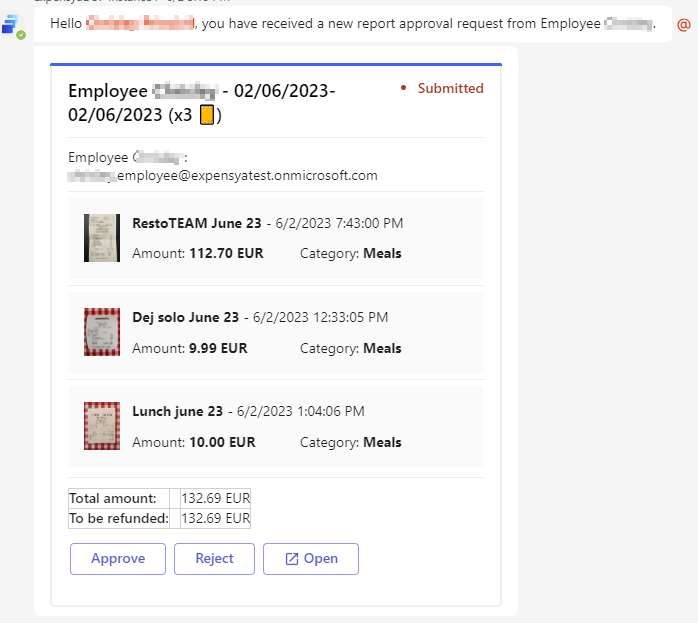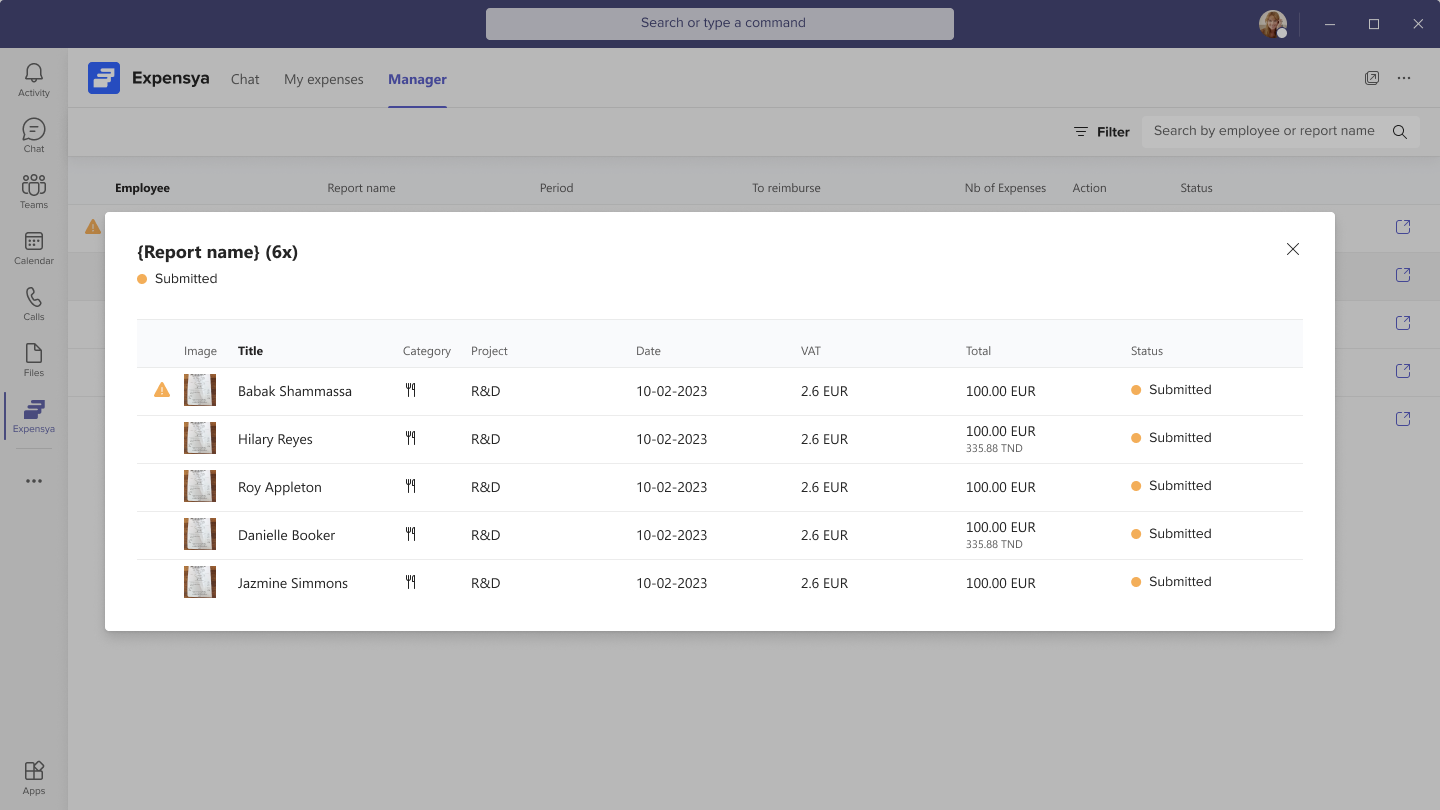 - Display Reports: As a manager, you can view the details of a report in Teams by clicking on it in the Manager tab. This opens a modal window displaying the list of expenses within the selected report. This feature is available on the web and mobile versions of Microsoft Teams.