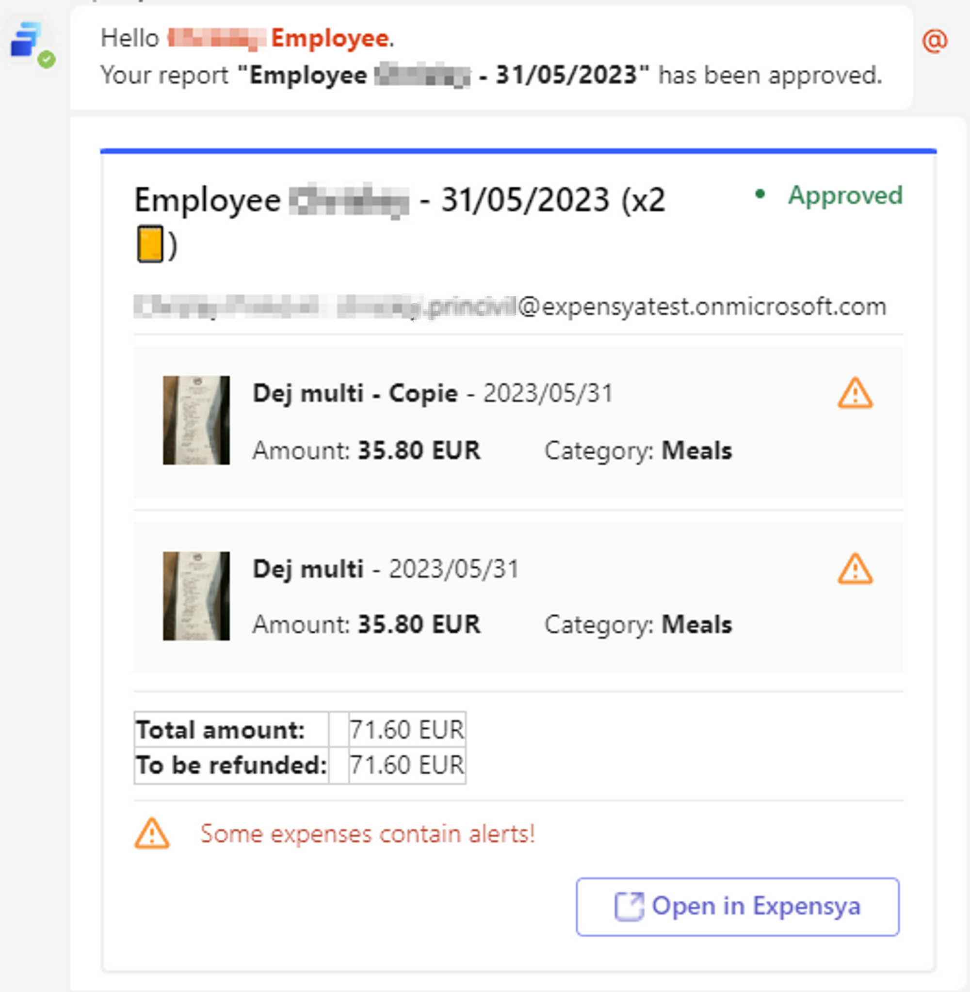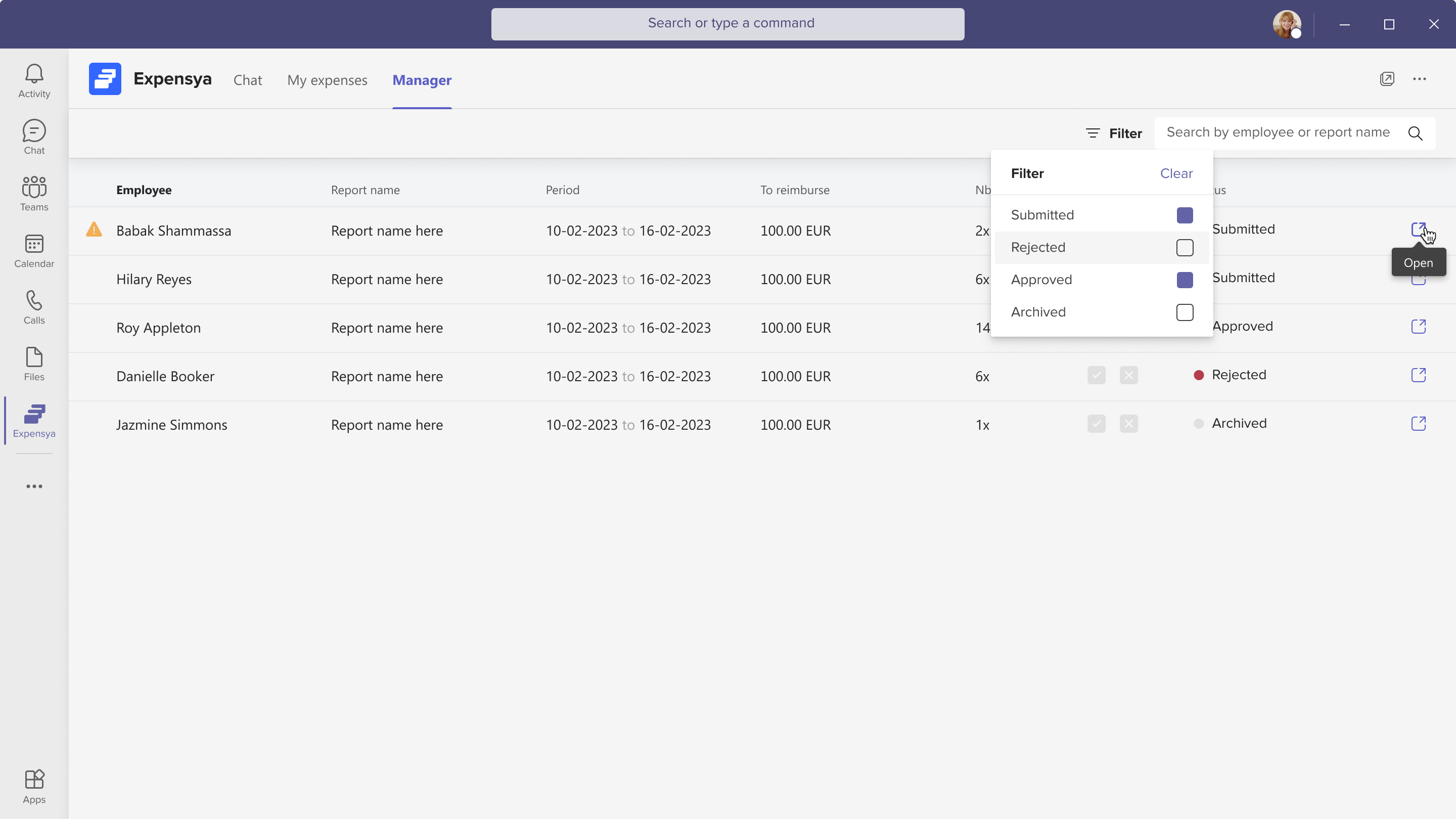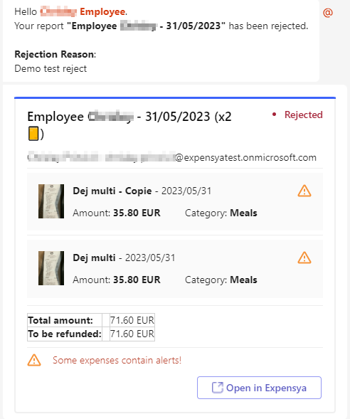 - Open in Expensya: Managers can open reports in the Expensya web application by clicking the Open in Expensya icon. This provides a more detailed view of the report and allows managers to take additional actions if needed.