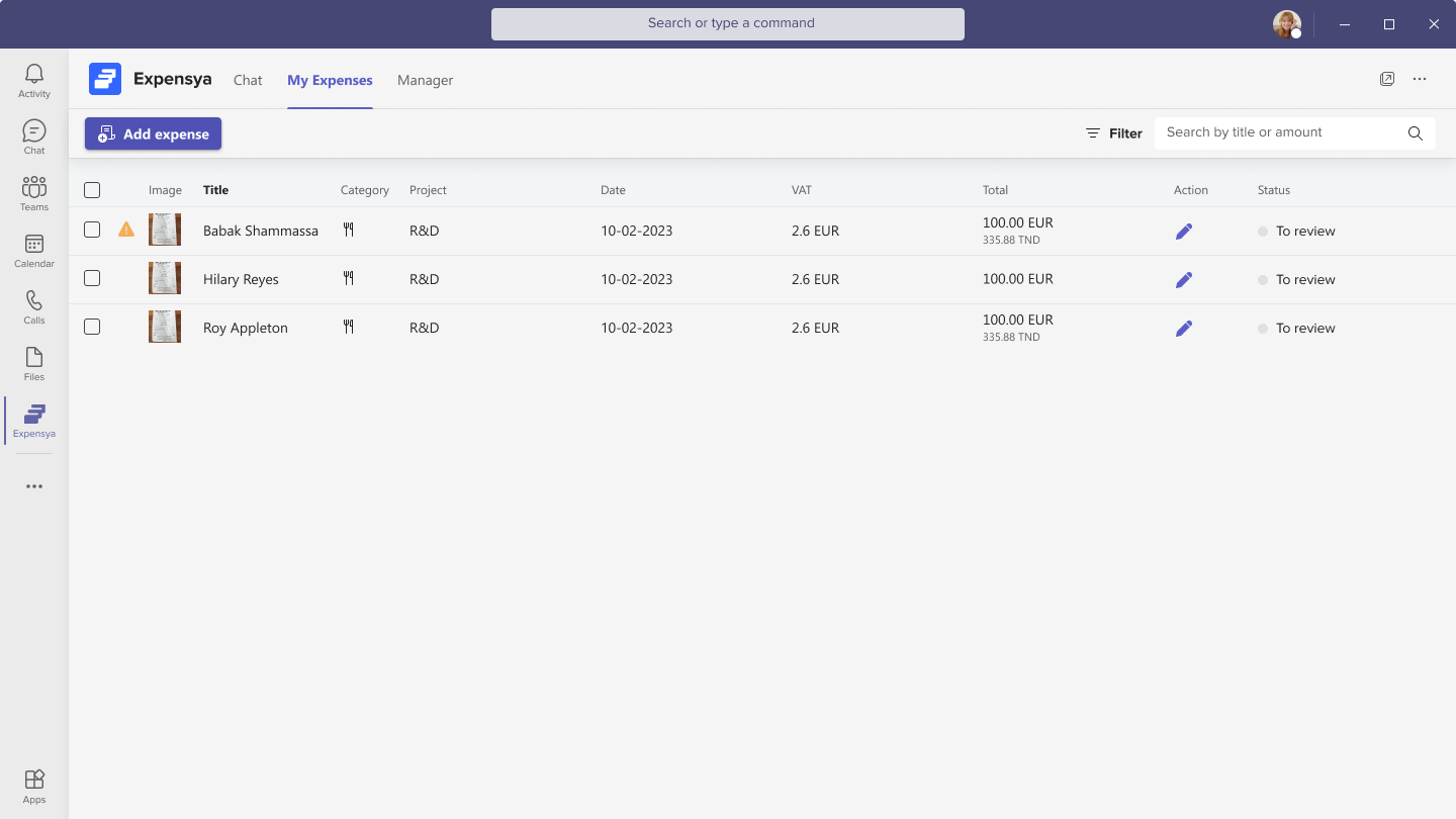 - Review Expenses: In the My Expenses tab, you can review expenses from Microsoft Teams. By clicking the pen icon, you open the expense form, allowing you to update expenses with the statuses To Verify, Rejected, or To Submit.