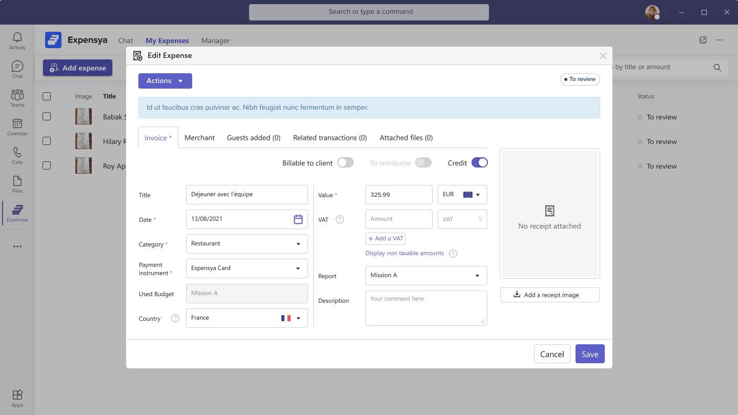 Note: All expenses can be updated in the Expensya application for Microsoft Teams, regardless of their source (Microsoft Teams or Expensya Web or Mobile).