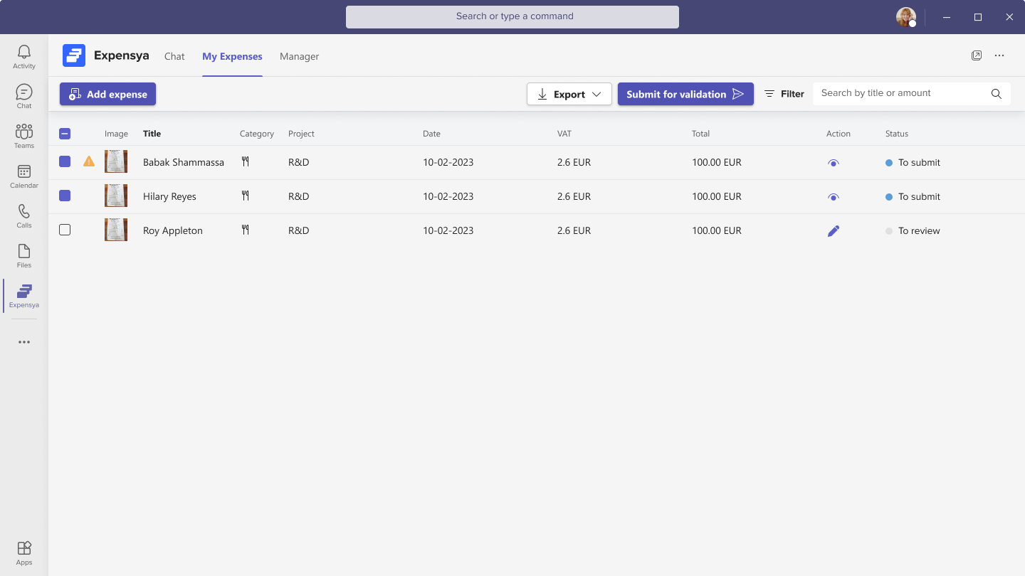 - Submit an Expense: From the My Expenses tab, you can submit expenses for validation. Select one or multiple expenses and click the Submit for Validation button. This feature is available on the web and mobile versions of Microsoft Teams.
